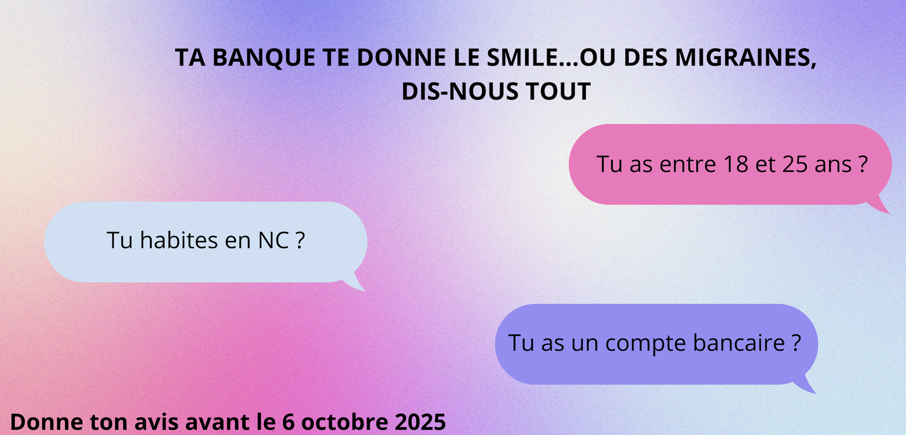 Les jeunes de 18 à 25 ans disposant d’un compte bancaire en Nouvelle-Calédonie sont invités à prendre quelques minutes pour répondre au questionnaire en ligne.